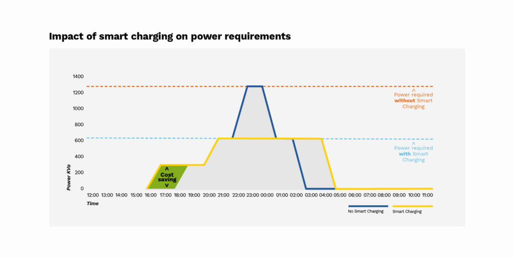 Met slimme oplaadsoftware kunnen wagenparkbeheerders de oplaadbelasting spreiden over de tijd. Dit betekent dat zij hun wagenpark van stroom kunnen voorzien en tegelijkertijd de maandelijkse pieken kunnen verlagen en de behoefte aan grote netaansluitingen kunnen verkleinen.
